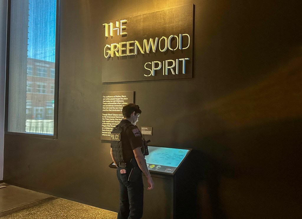 On a recent Friday, about a dozen Tulsa Police Academy cadets visited the Greenwood Rising museum. Upon entering they stood face to face with bold lettering on the museum’s walls.