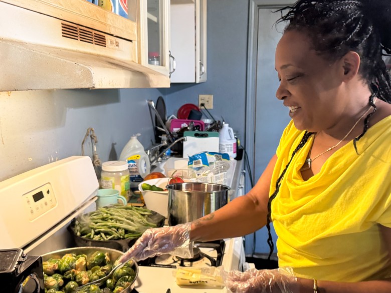 Brussels sprouts and green beans sizzle over a small, four-burner stove in Brandi Johnson’s kitchen — a one window room in her uncle’s modest 80-year-old house.