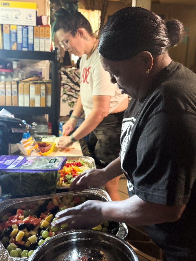 But feeding 50 to 80 people a week is something she can’t — and hasn’t — done alone. As Johnson checks the pots on the stove, her housemate, LaShele White, preps chicken and fruit.